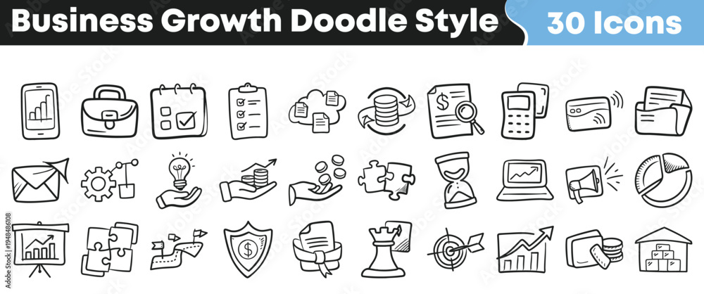 Collection of thirty hand drawn doodle style business growth icons representing finance strategy planning and success elements #1948486108