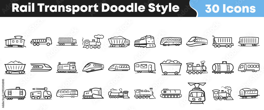 Collection of thirty unique doodle style rail transport icons featuring various trains locomotives and railway rolling stock components #1933436848