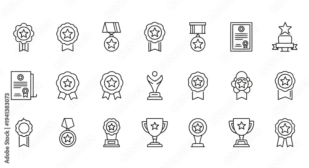 • #1941383073 Collection of various achievement and award icons in a minimalist line art style
