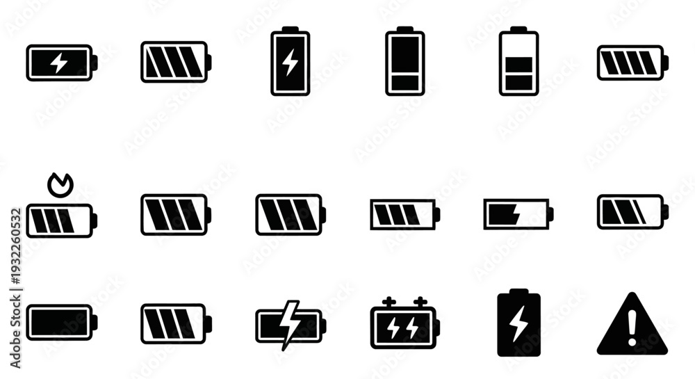 Collection of various battery icons displaying different charge levels and statuses #1932260532