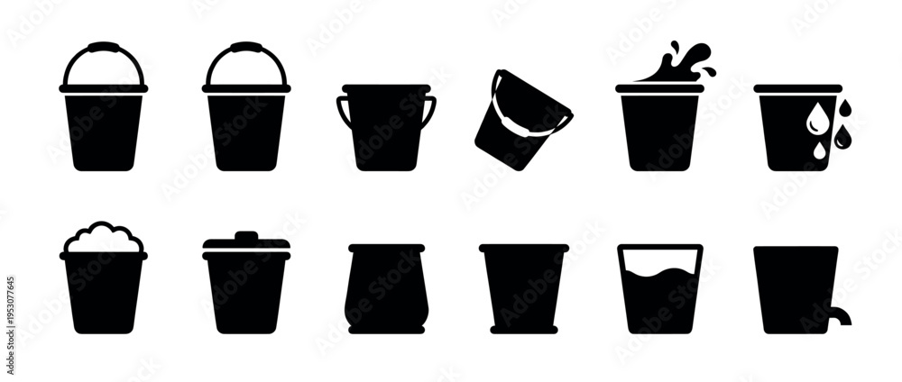 Collection of various black silhouette bucket icons, depicting different types of pails, some with handles, some full of liquid, foam, or spilling, in a clean graphic style #1953077645