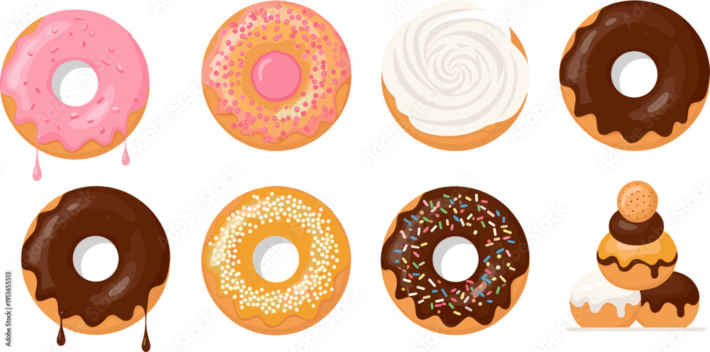 Colorful assorted glazed donuts collection, vector illustration of sweet bakery treats with chocolate, sprinkles, icing and frosting toppings #1913655513