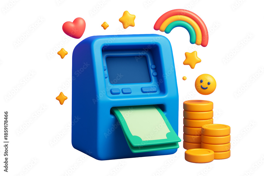 Colorful ATM machine with cash and coin stacks, surrounded by fun emoji-style icons, in playful cartoon style on white background. Ai generative #1859178466