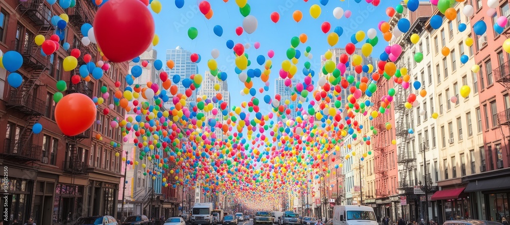 Colorful balloons floating over urban street canyon #1938152550