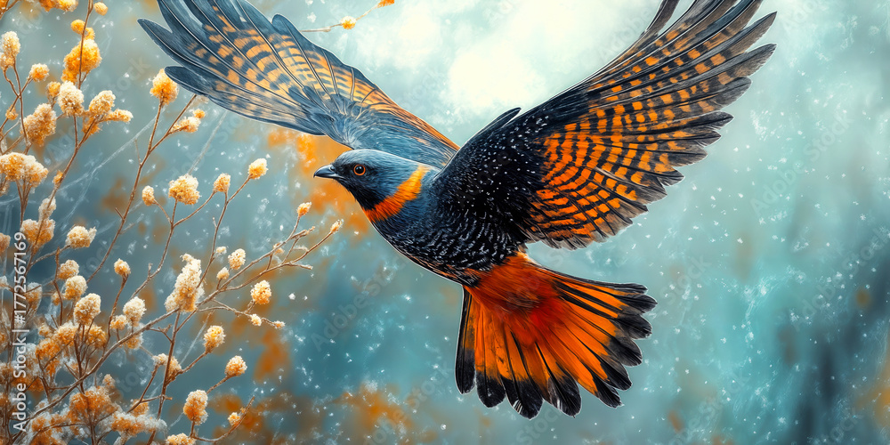 Colorful bird with orange and black plumage flying over snow-covered plants in winter forest with blue-gray blurred background #1772567169