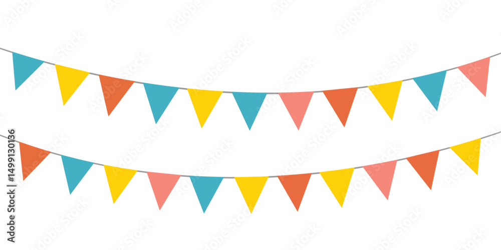 Colorful bunting flags on string for birthday party decoration, holiday anniversary fabric garland design, modern festive hanging decor. Isolated. Vector illustration. #1499130136