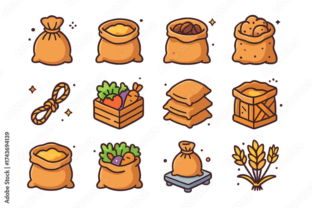 Colorful Burlap Sack Icons. Burlap sack. Colorful isometric vector icons set of burlap sack: tied burlap sack, grain bag, coffee bean sack, potato sack, wheat #1743694139