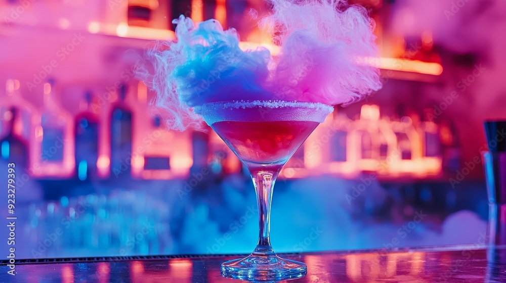 Colorful Cocktail with Smoke Effect in Trendy Neon Bar Ambiance #923279393