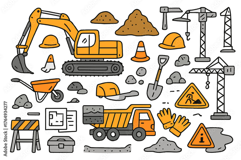 Colorful Construction Doodles. Construction equipment. Hand-drawn doodle illustration excavator (colored), dirt pile (colored), construction site (colored), #1764934277