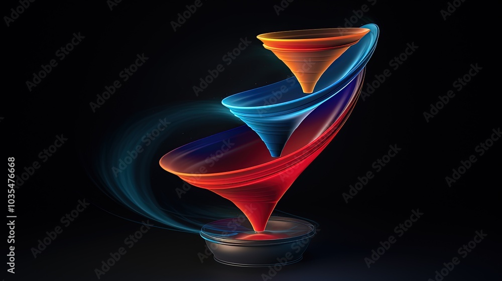 Colorful 3D funnel model flow 5 step, levitating on dark blue background, Generative Ai #1035476668