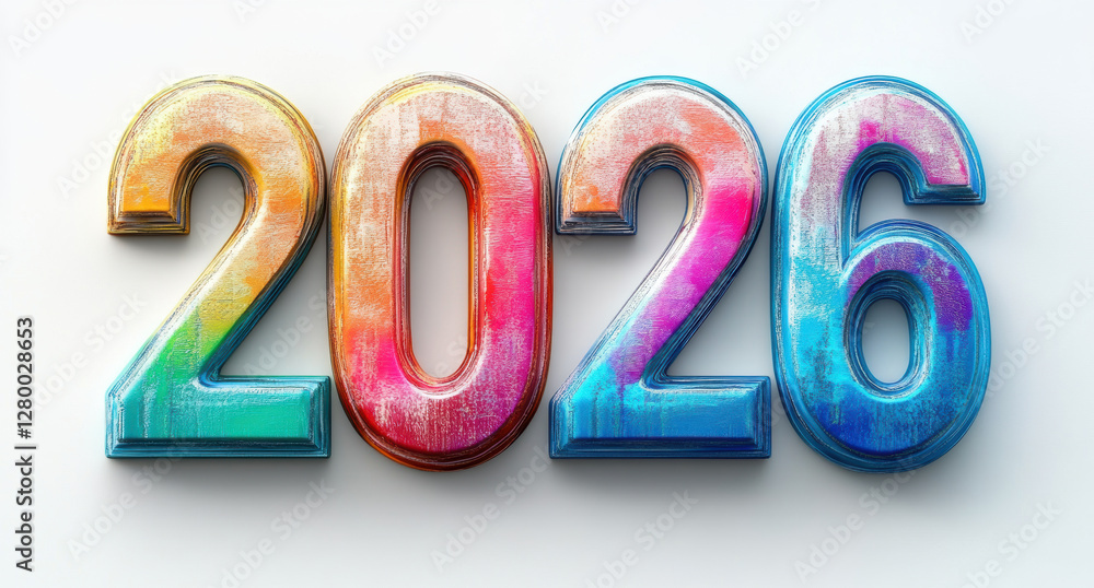 Colorful 3D text of year 2026 on white background, showcasing vibrant hues and artistic design. Perfect for celebrations and events #1280028653