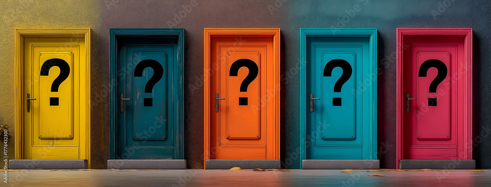 Colorful doors with question marks symbolize choices, mystery, and the unknown in life. #1776432300