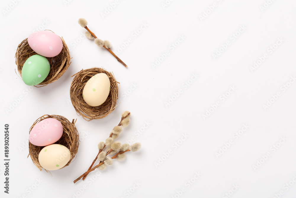 Colorful easter eggs in nests with flowers on color background, top view #1893020540