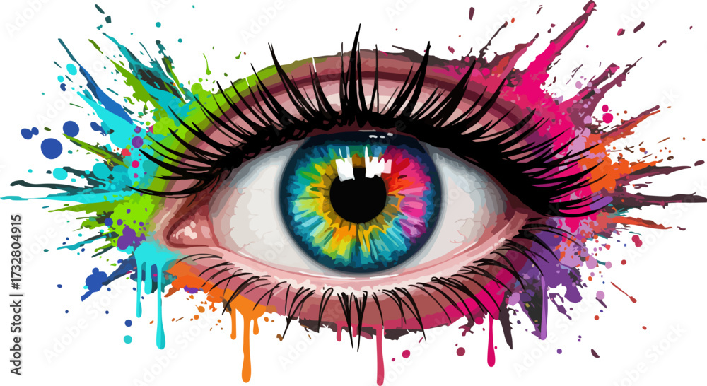 Colorful eye with rainbow iris surrounded by vibrant paint splatters on black background #1732804915
