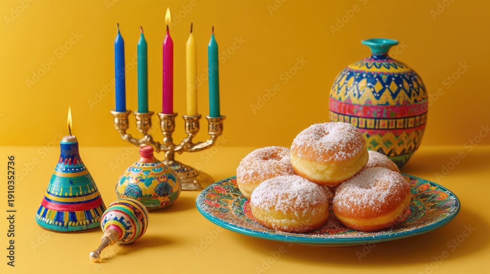 Colorful Festival Table Setting with Delicious Donuts, Candles, Decorative Vase, and Traditional Items on a Bright Yellow Background for Celebrations #1910352736