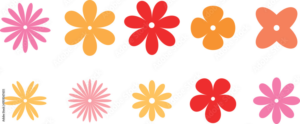 Colorful flat flower icons set simple Hippy groovy daisy flowers set floral shapes collection #1939367635