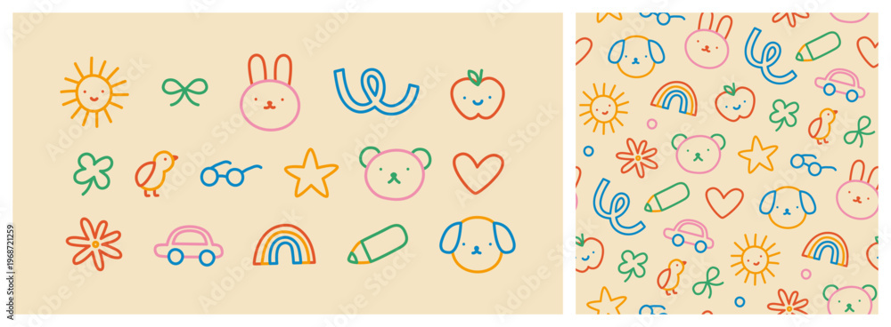 Colorful funny children doodle and seamless pattern set. Cute happy kid drawing symbol collection, diverse educational concept illustration bundle. Hand drawn diverse graphic elements. Includes dog, a #1968721259