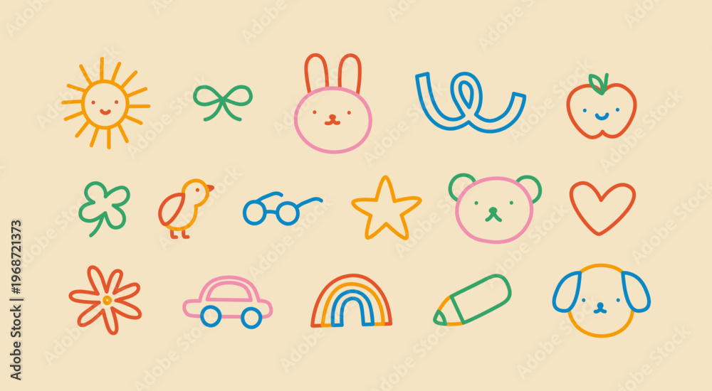 Colorful funny children doodle icon set. Cute happy kid drawing symbol collection, diverse education concept illustration bundle. Hand drawn diverse graphic elements. Includes dog, apple, rainbow. #1968721373
