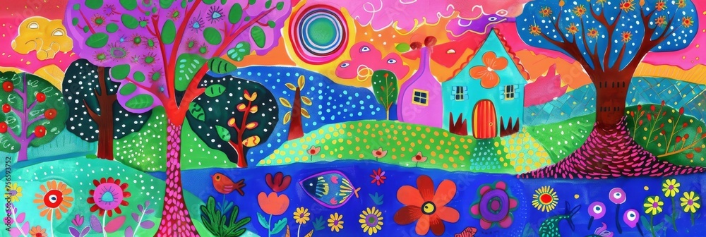 Colorful Landscape with a House, Pond and Fish, Naive Art Drawing Imitation #756593752