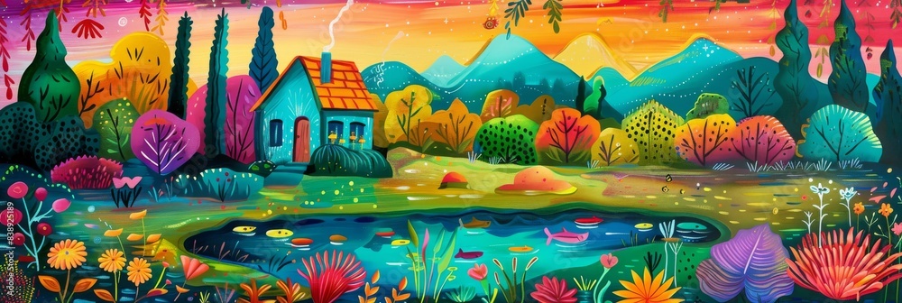 Colorful Landscape with a House, Pond and Fish, Naive Art Drawing Imitation #838925189