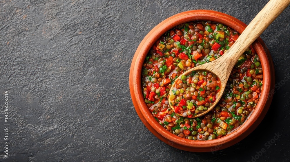 Colorful lentil stew in clay pot with rustic wooden spoon, plantbased eating, traditional global comfort food #1809443416
