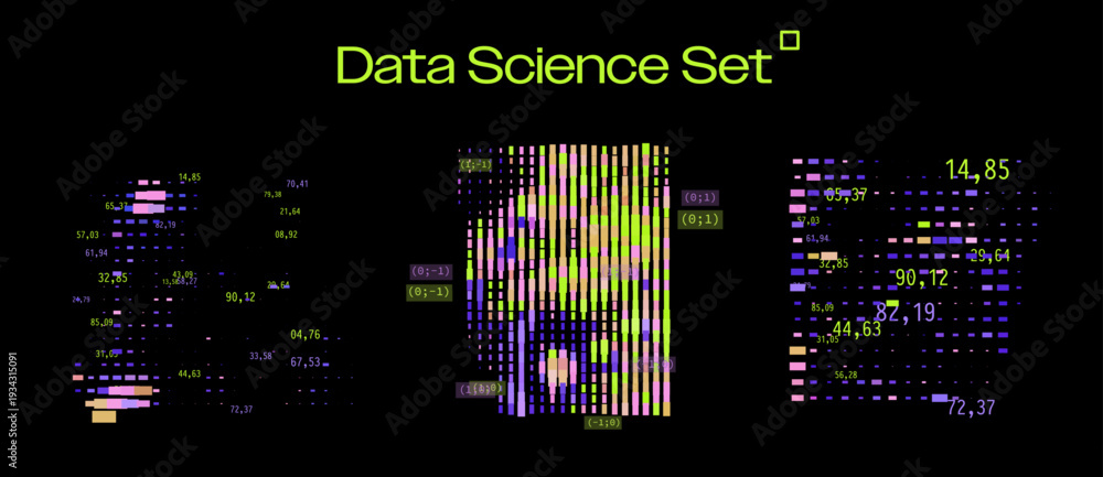 Colorful pixel heatmap with coordinates, numbers and neon scatter circles in abstract data matrix art. Conceptual vector illustration for data science and big data visualization. #1934315091