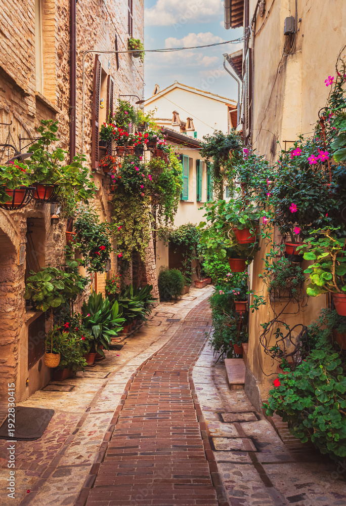 Colorful potted plants decorating stone street in historic Spello #1922830415