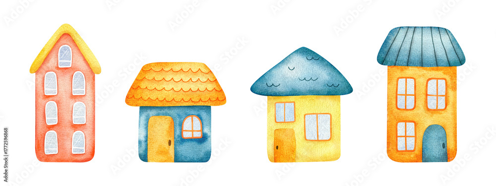 Colorful set of cozy houses in children's style. Collection isolated hand drawn watercolor Illustrations. Clip art of lodge for baby poster, kids goods, textile, albums, stationery, wrapping, apparel. #1772596868