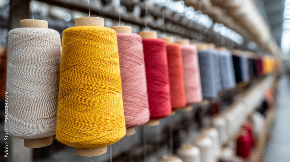Colorful spool of thread and yarn at textile factory. Vibrant view of manufacturing and sewing production line #1678432729