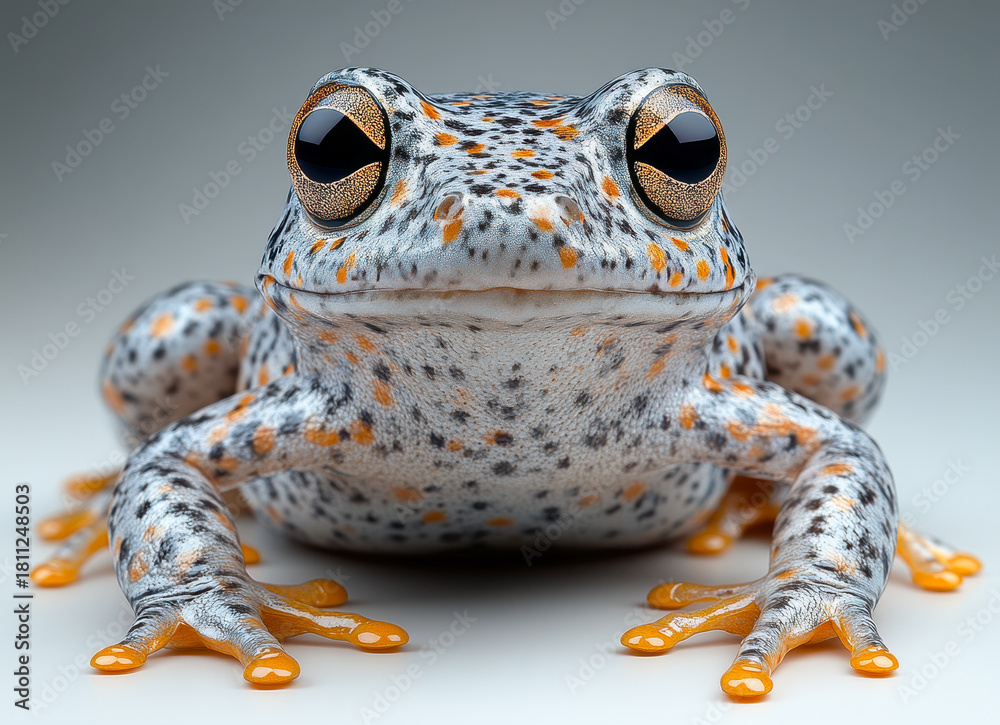 Colorful spotted frog close-up portrait with orange and black eyes on gradient background in vivid detailed wildlife photo #1811248503