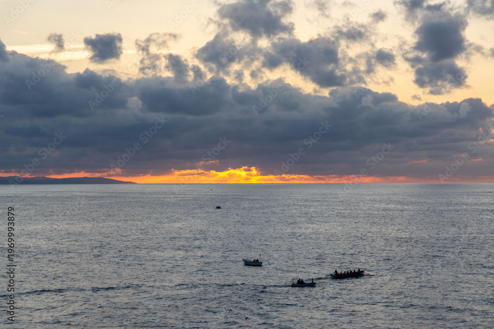 Colorful sunrise over the Cantabrian Sea with a traditional Basque rowing boat training near the coast of San Sebastian in the Basque Country, Spain. #1969993879