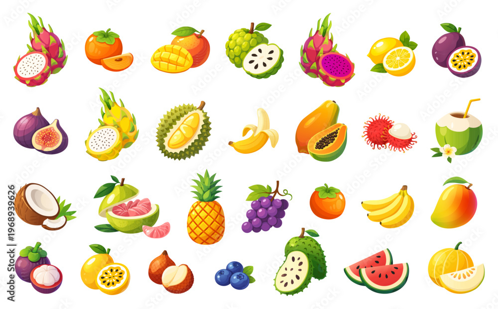 Colorful tropical fruit vector set with dragon fruit mango durian papaya pineapple coconut banana and other exotic fruits #1968939626