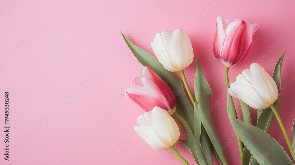 Colorful Tulips Laid on a Pink Background in a Simple Floral Arrangement During Daytime #1949330248