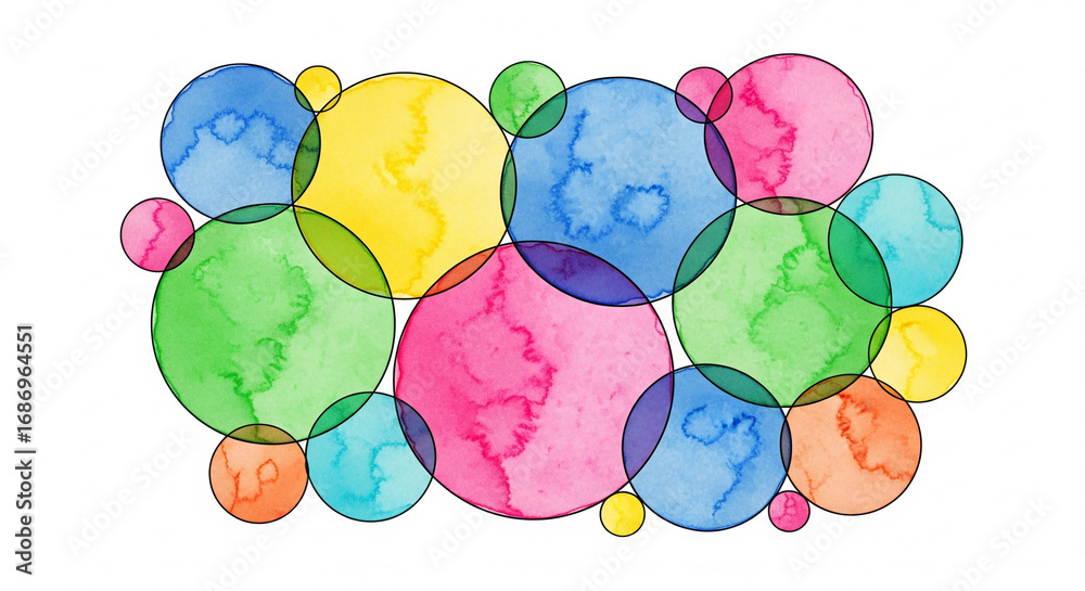 Colorful watercolor abstract circles overlapping to create a vibrant artistic pattern on an isolated transparent background. #1686964551
