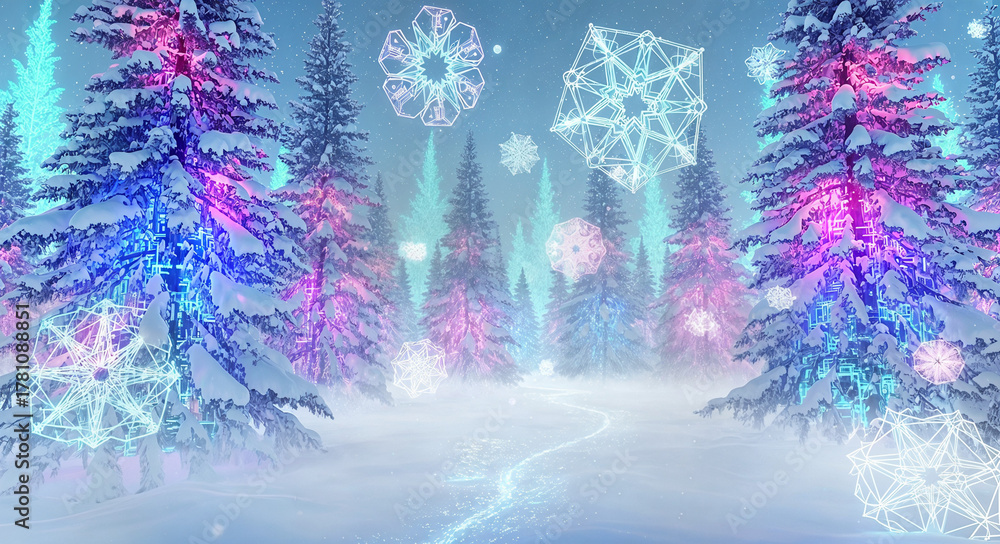 Colorful winter forest with glowing snowflakes in a misty landscape #1781088851