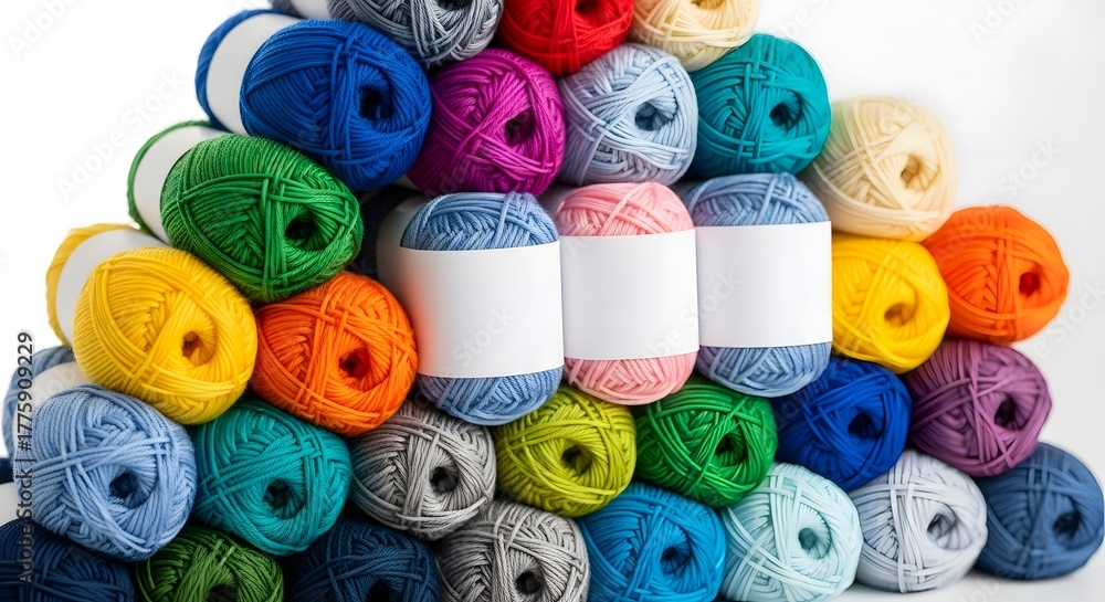 Colorful Yarn Skeins Stacked in Pyramid Crafting Supplies Background #1775909229