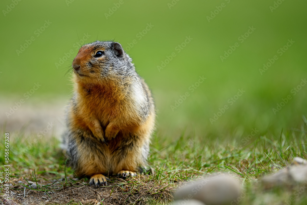Columbian ground squirrel (Urocitellus columbianus) standing at the entrance of its burrow in Ernest Calloway Manning Park, British Columbia, Canada #516867328
