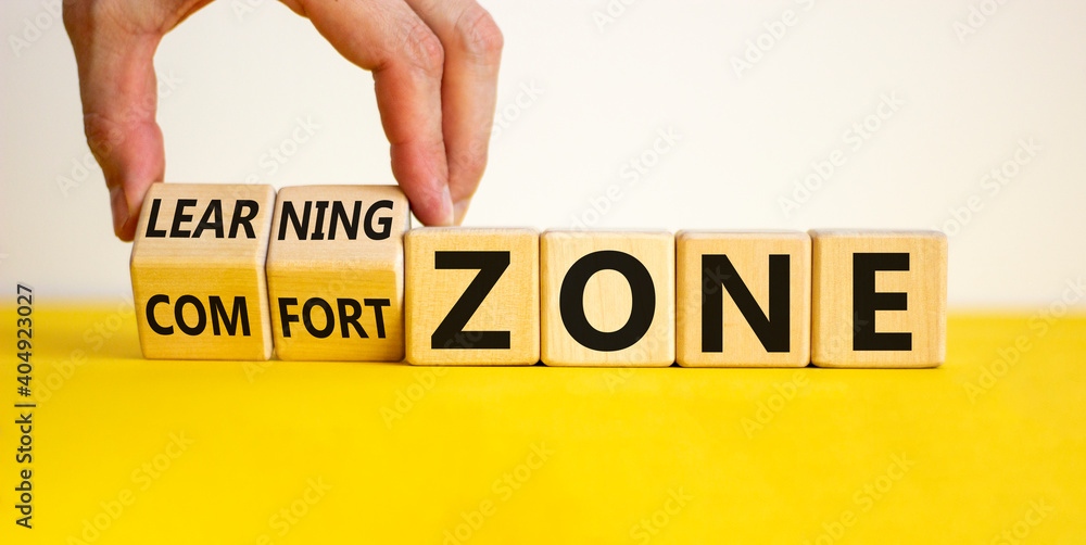 Comfort or learning zone symbol. Hand turns wooden cubes and changes words 'comfort zone' to 'learning zone'. Beautiful yellow table, white background, copy space. Business, psychology concept. #404923027