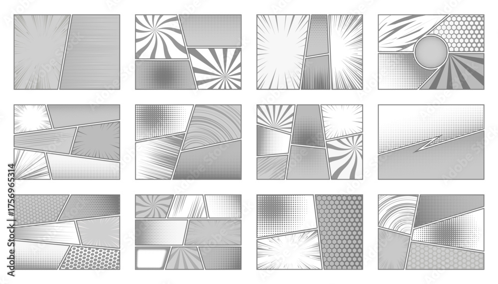 Comic book background. Manga monochrome templates and layout pages with grid. Anime backdrops set with collage of halftone effect and speed lines. Vector graphic illustration #1756965314