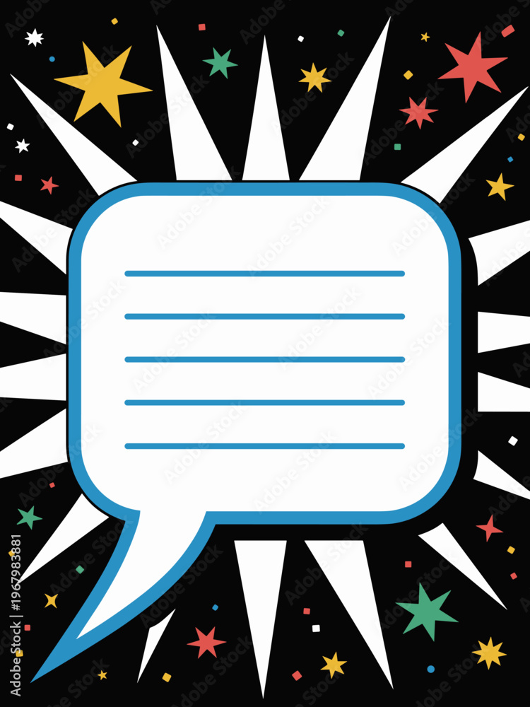 Comic book speech bubble frame on a dynamic black background with colorful star icons and confetti elements for creative text writing, festive party invitation board, announcement banner or retro post #1967983881