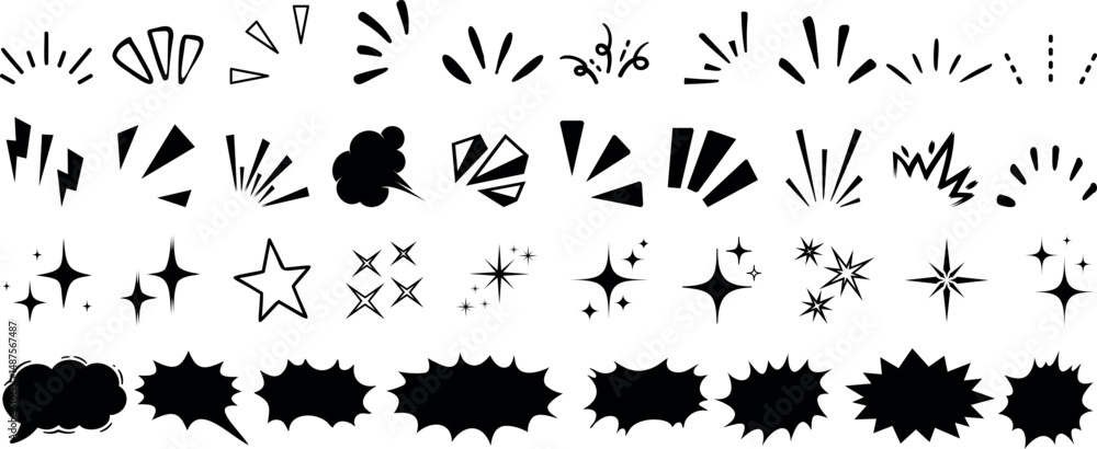 Comic explosion element, star burst, speech bubble, and sparkle icon collection in black silhouette style. Perfect for pop art, retro comics, and cartoon effects in graphic design projects #1487567487