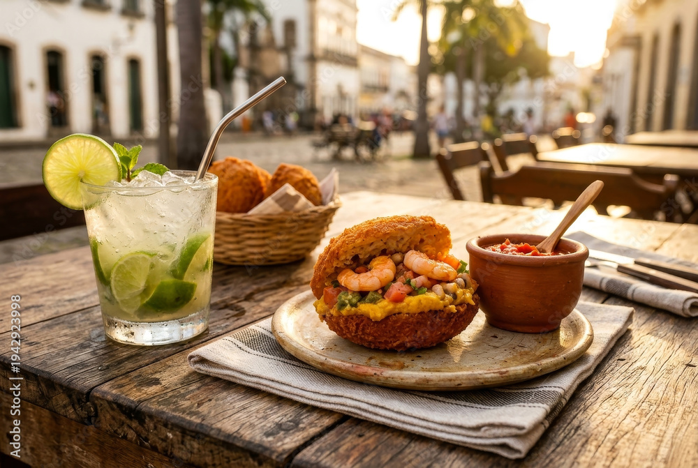 Comida típica baiana acarajé com camarão e caipirinha de limão em mesa de madeira ao pôr do sol #1942923998