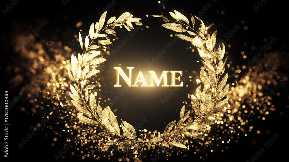 commemoration. Golden laurel wreath encircling glowing name inscription, honor theme, elegant composition. event programs, museum guides, designed for cultural heritage projects and event programs. #1782000343