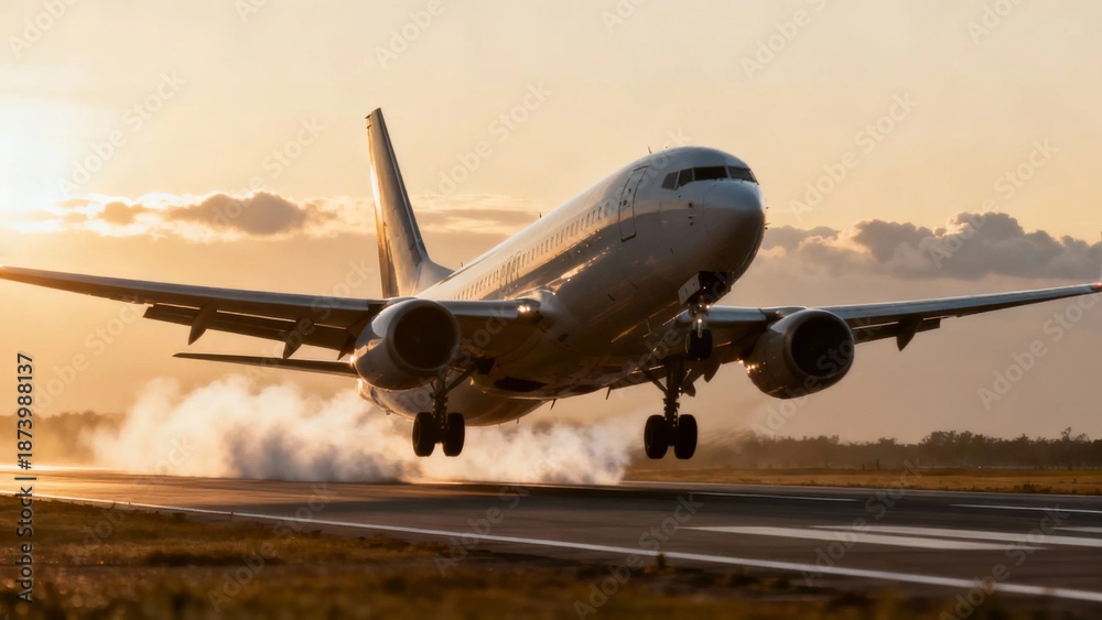 Commercial airplane taking off from runway during sunset with smoke trailing behind #1873988137