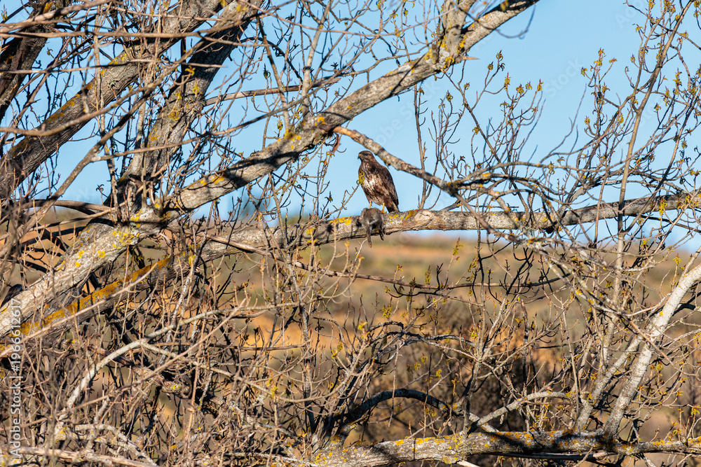 Common Buzzard with a rabbit in its talons on a tree branch. Buteo buteo. #1966612617