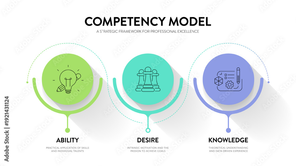 Competency Model Infographic Vector. Ability, Desire, and Knowledge strategic framework for professional excellence. Ideal for HR management, talent development, and business presentation slides. #1921431124