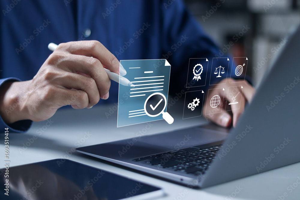 Compliance rules and law regulation policy concept. Enforcement of laws, regulations, and standards. Businessman use laptop with virtual icon. #1693519414
