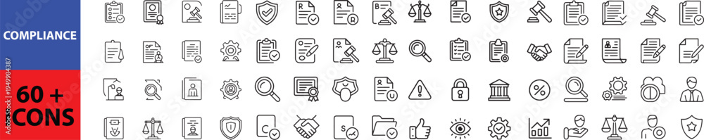 Compliance web icons in line style. Regulations, policy, legal document, quality control, responsibility, law. Editable stroke. Outline icon in linear style #1949984387