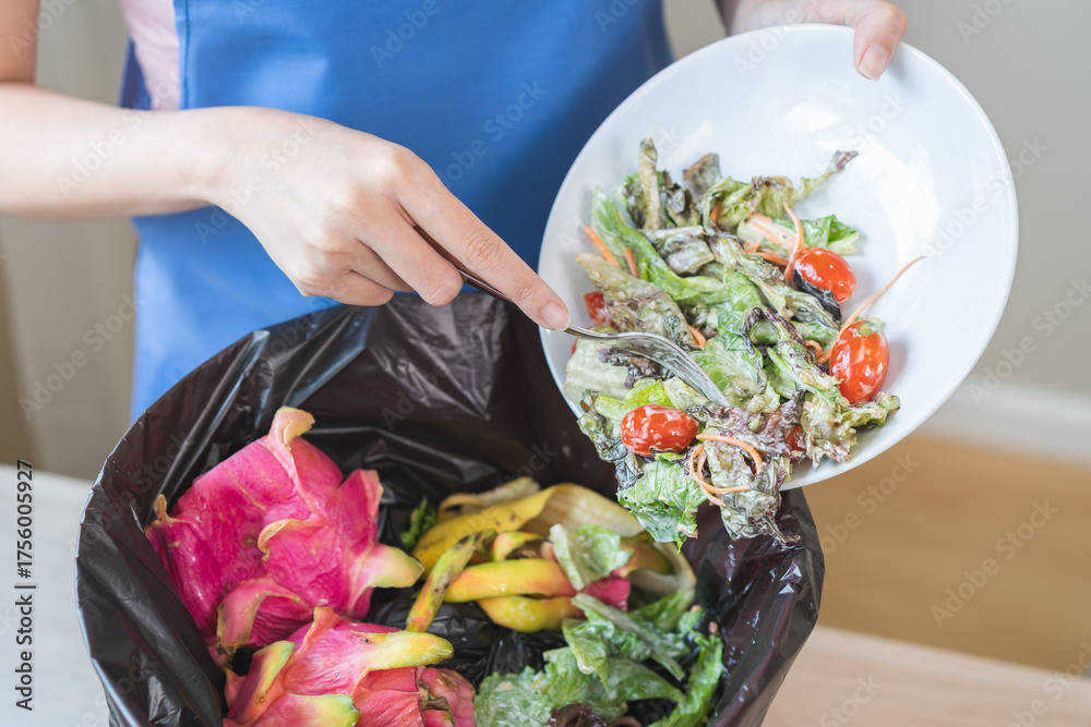 Compost from leftover food housekeeper woman, female hand holding salad dish or plate use fork scraping waste, rotten vegetable throwing away into garbage, trash or bin. Environmentally responsible. #1756005927