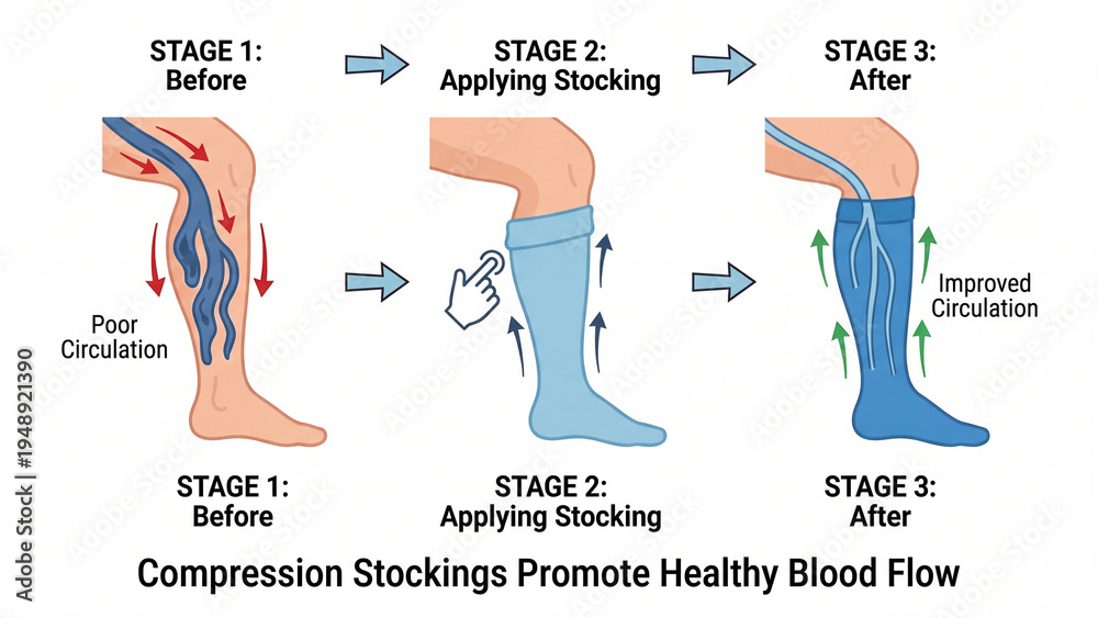 Compression stockings medical education infographic illustrating three stages from poor circulation through application to improved blood flow for venous health #1948921390